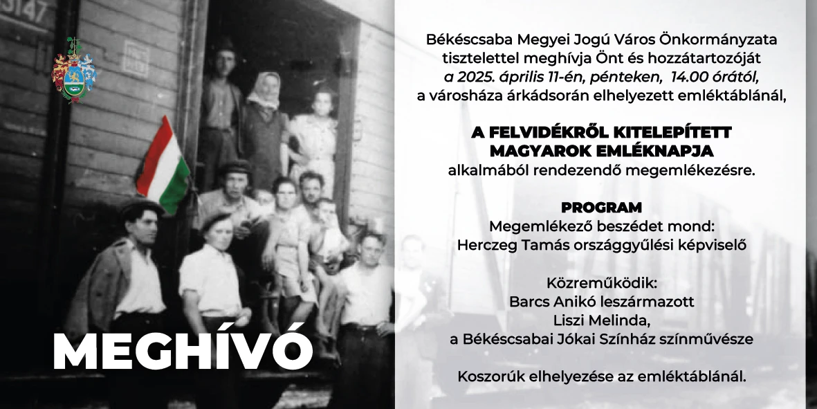 Békéscsaba Megyei Jogú Város Önkormányzata tisztelettel meghívja Önt és hozzátartozóját a 2025. április 11-én pénteken, 14.00 órától, a városháza árkádsorán elhelyezett emléktáblánál, a felvidékről kitelepített magyarok emléknapja alkalmából rendezendő megemlékezésre.