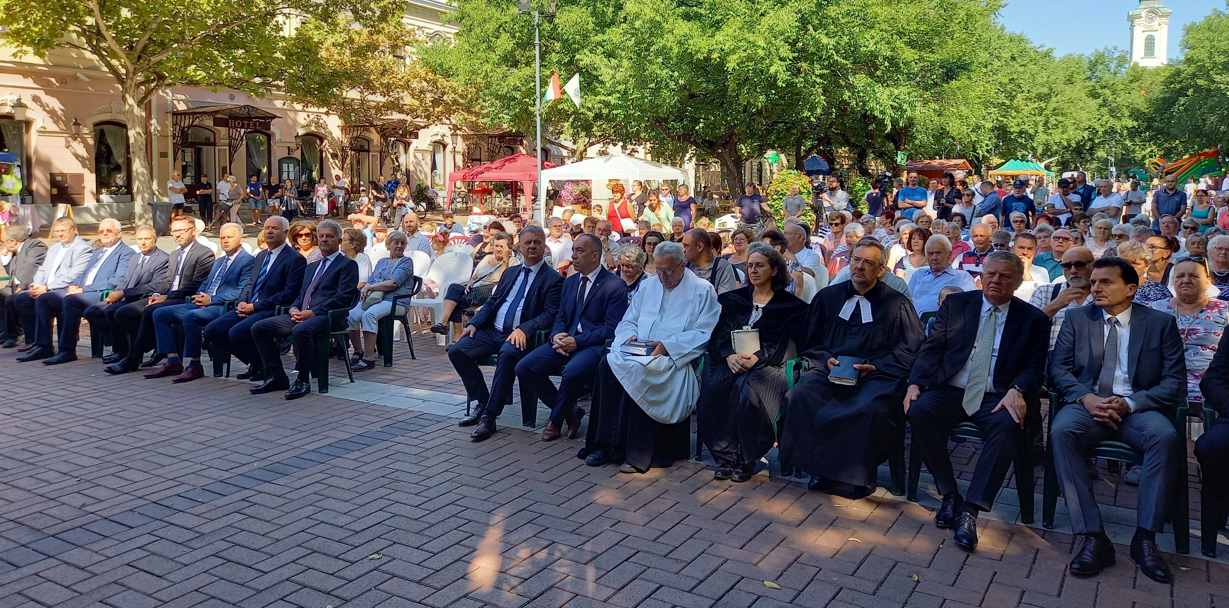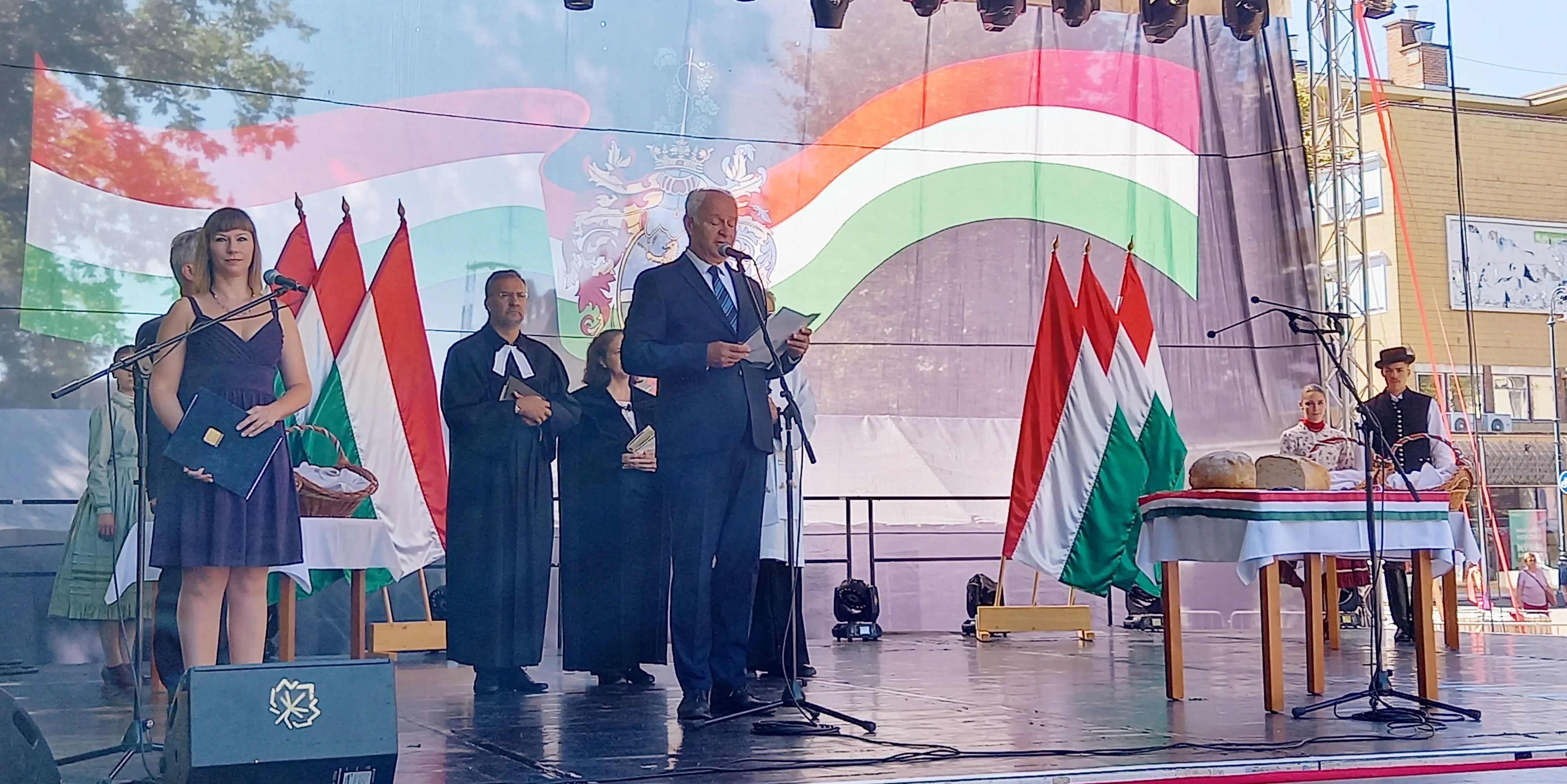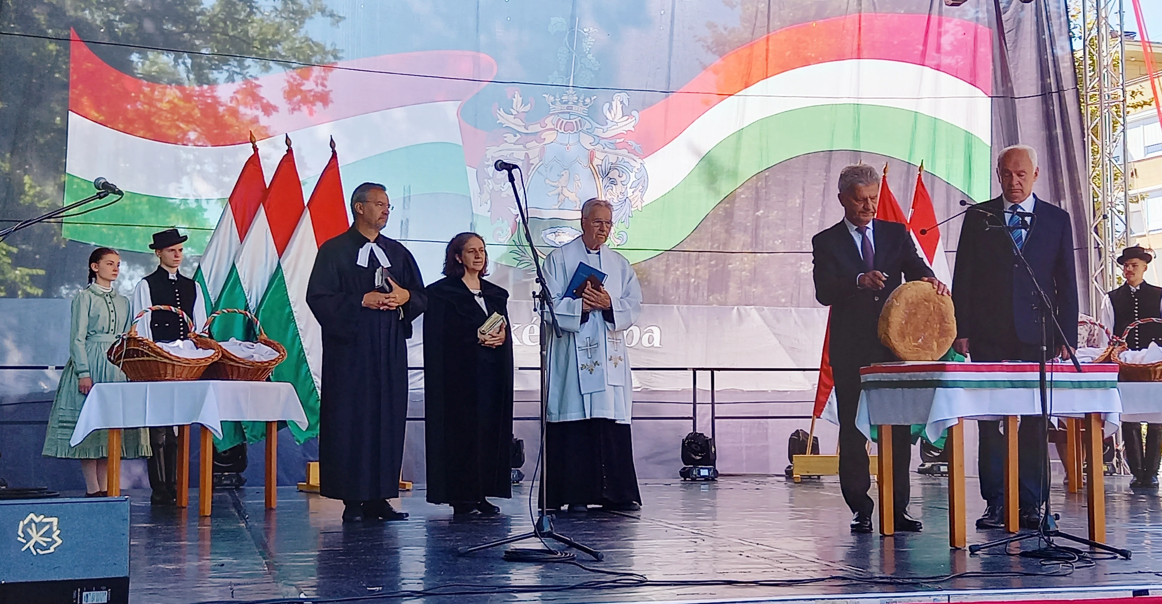 Minden év augusztus 20-án elődeinkre emlékezünk országszerte, azokra a hagyományokra, szokásokra, amelyek erőt, tartást, hitet adtak nemzetünknek. A búza és a föld összekapcsolja az új kenyeret államiságunkkal, történelmünkkel és magyarság tudatunkkal is. Az aratás után hagyományosan Szent István napra sütötték az új búzából készült első kenyeret, amely az életet, a megélhetést és az otthont szimbolizálja. Nemzeti színű szalaggal átkötött formája fejezi ki az élet és a haza összekapcsolódását. Az új lisztből készült kenyér az ünnepi asztal ékessége lett, és jelképévé vált az államiság ünnepének, amelyet ezúttal Szigeti Antal plébános szentelt meg, illetve Kutyej Pál evangélikus lelkész és nagytiszteletű Nagy Mónika református lelkipásztor áldott meg. Az új kenyeret Szarvas Péter polgármester szegte meg, majd azt követően Herczeg Tamás országgyűlési képviselő mondott beszédet.