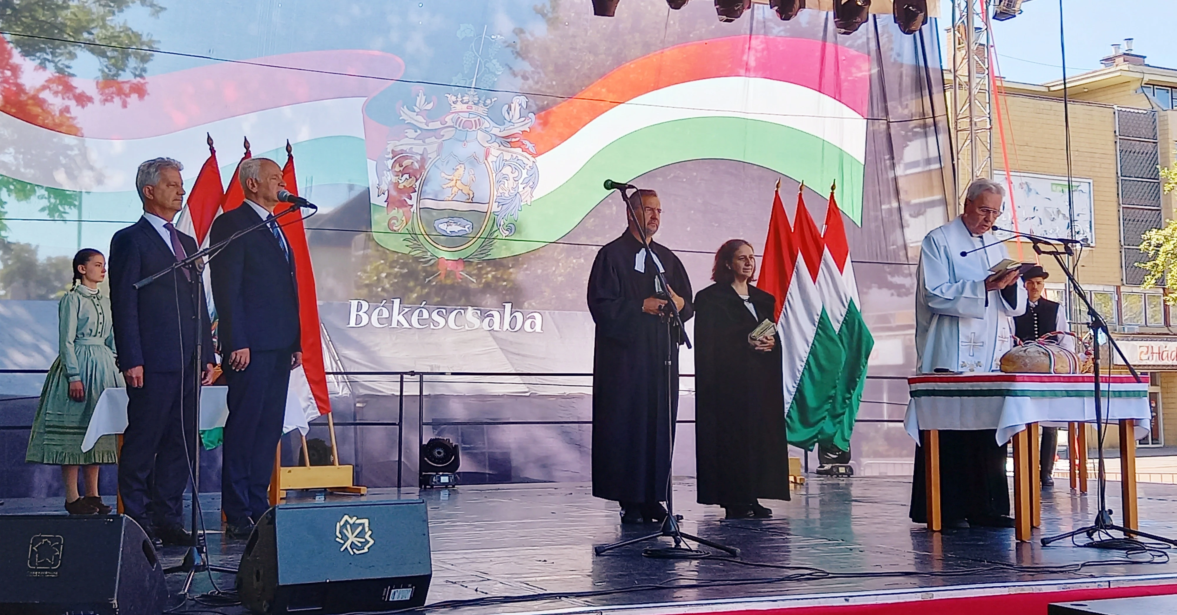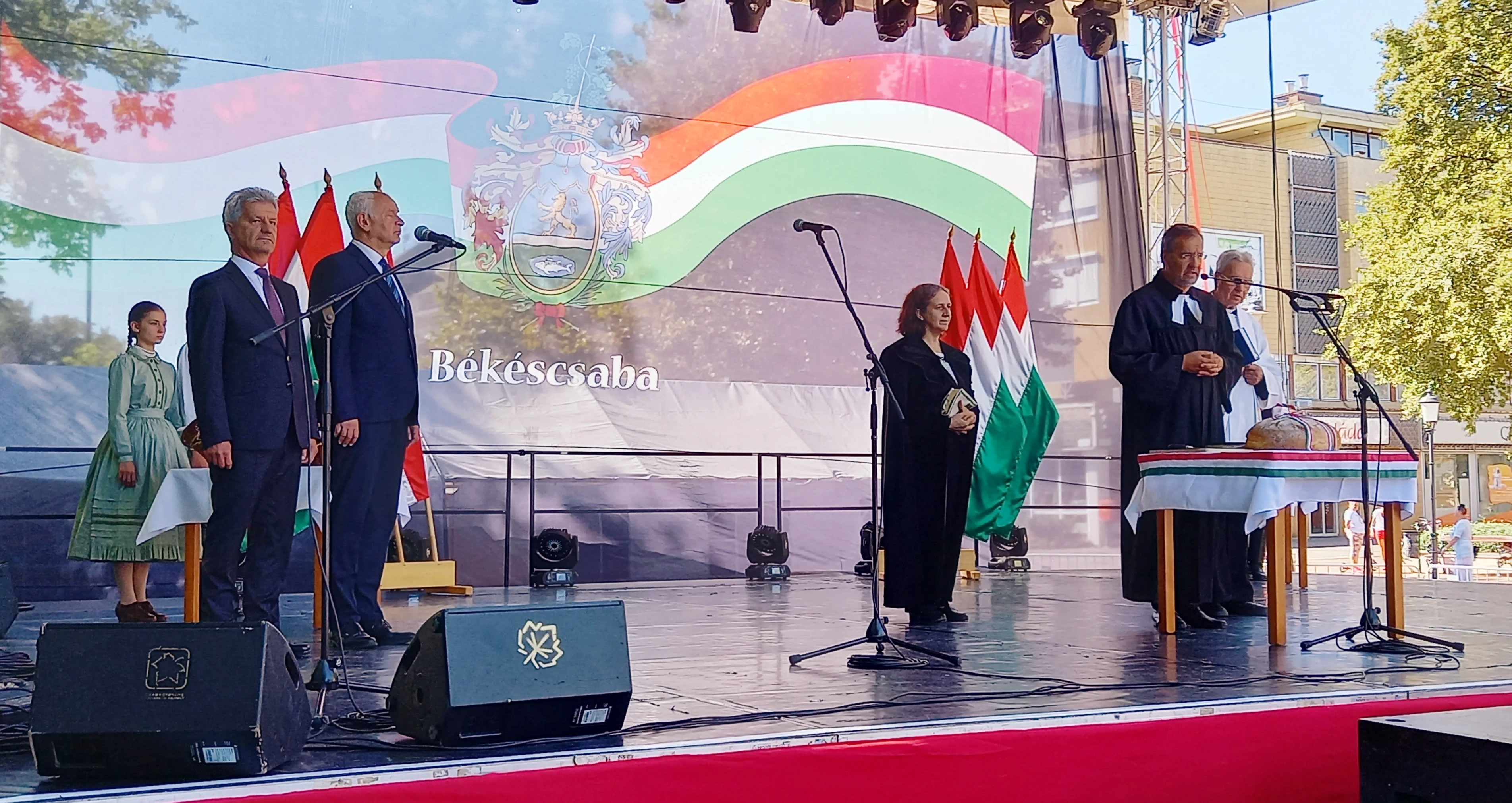 Szarvas Péter polgármester esti, ünnepi beszédében kihangsúlyozta, köszönet illeti meg a pedagógusokat, a szociális szférában és az egészségügyben dolgozókat, a rendőrség állományát, akik valamennyien példa értékűen helyt álltak a járvány időszakában. Mint fogalmazott, „felemelő érzés volt látni, megtapasztalni azt az összefogást, amellyel a csabaiak egymás felé fordultak.” A városvezető kitért arra is, hogy „térségünk Szent István korában is gazdag és intenzíven fejlődő volt. És ez ma sincs másképpen. Városunk fejlődése most is töretlen. Békéscsabán a koronavírus miatt elrendelt veszélyhelyzet alatt sem állt meg az élet, jelenleg is 14 helyszínen zajlik önkormányzati beruházás.” Említést tett a három békéscsabai sportolóról is, akik közelmúltbéli teljesítményükkel példaként szolgálnak mindannyiunk számára. A tokiói olimpiai játékokon városunk három kiváló sportolója is megmérette magát. A polgármester záró gondolataiban kitért arra is, hogy „Szent István hagyatéka igazi ajándék nekünk, magyaroknak. Öröksége arra kötelez minket, hogy őrizzük azt meg és folytassuk államunk építését. Ne feledjük, céljainkat csak közösen, szorgalmas és gondos munkával érhetjük el! Maradjunk hát mindig ilyen összetartó, egymást segítő közösség, amely együttes erővel képes Békéscsaba jövőjét tovább építeni!”