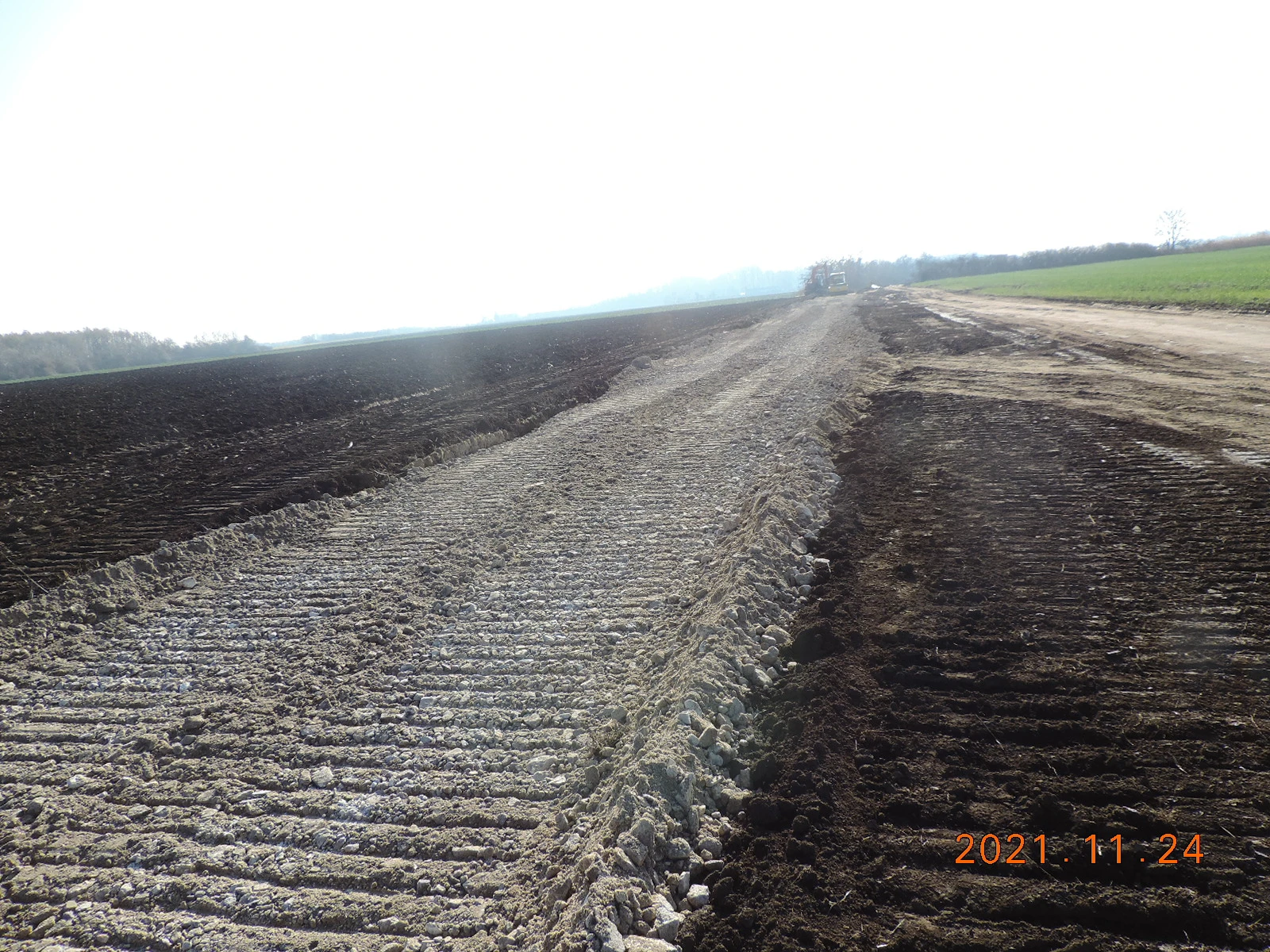 A Gerla belterület - Póstelek külterületi földút alapozás nagy ütemben folyik, a kőterítést végzik, a földút nem járható.