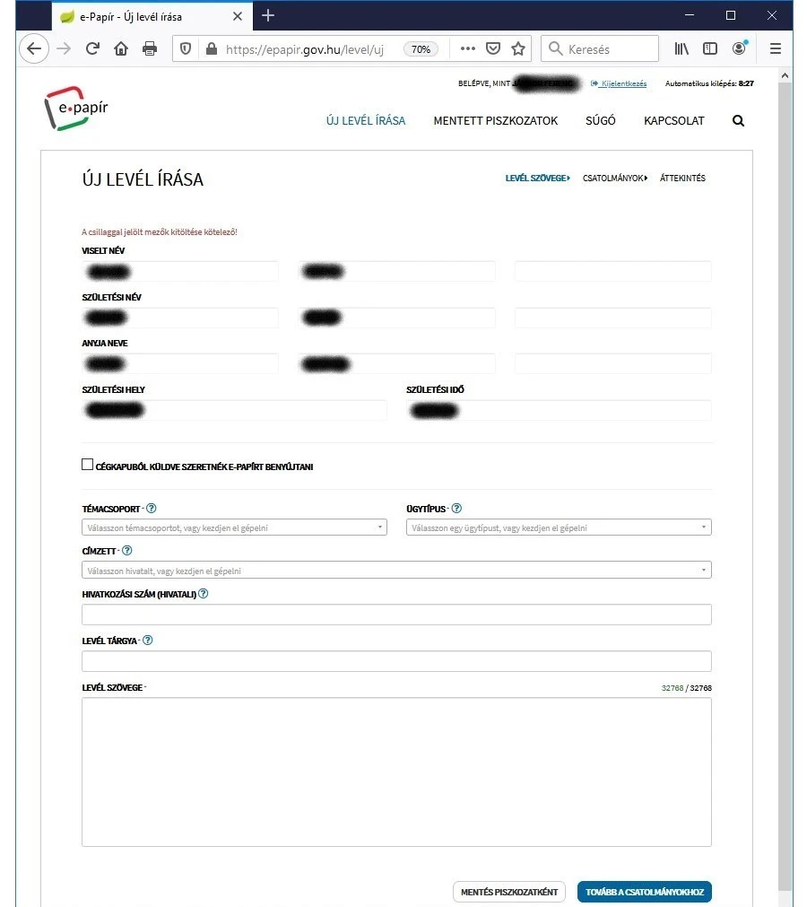 Bejelentkezést követően az ügyfél saját adatai automatikusan betöltődnek az E-papír nyomtatványra.