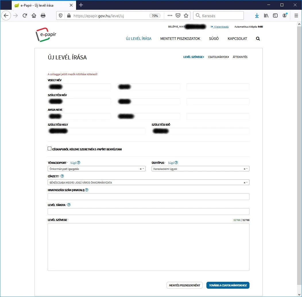 - a címzettet a lenyíló felsorolásból (Békéscsaba Megyei Jogú Város Önkormányzata),