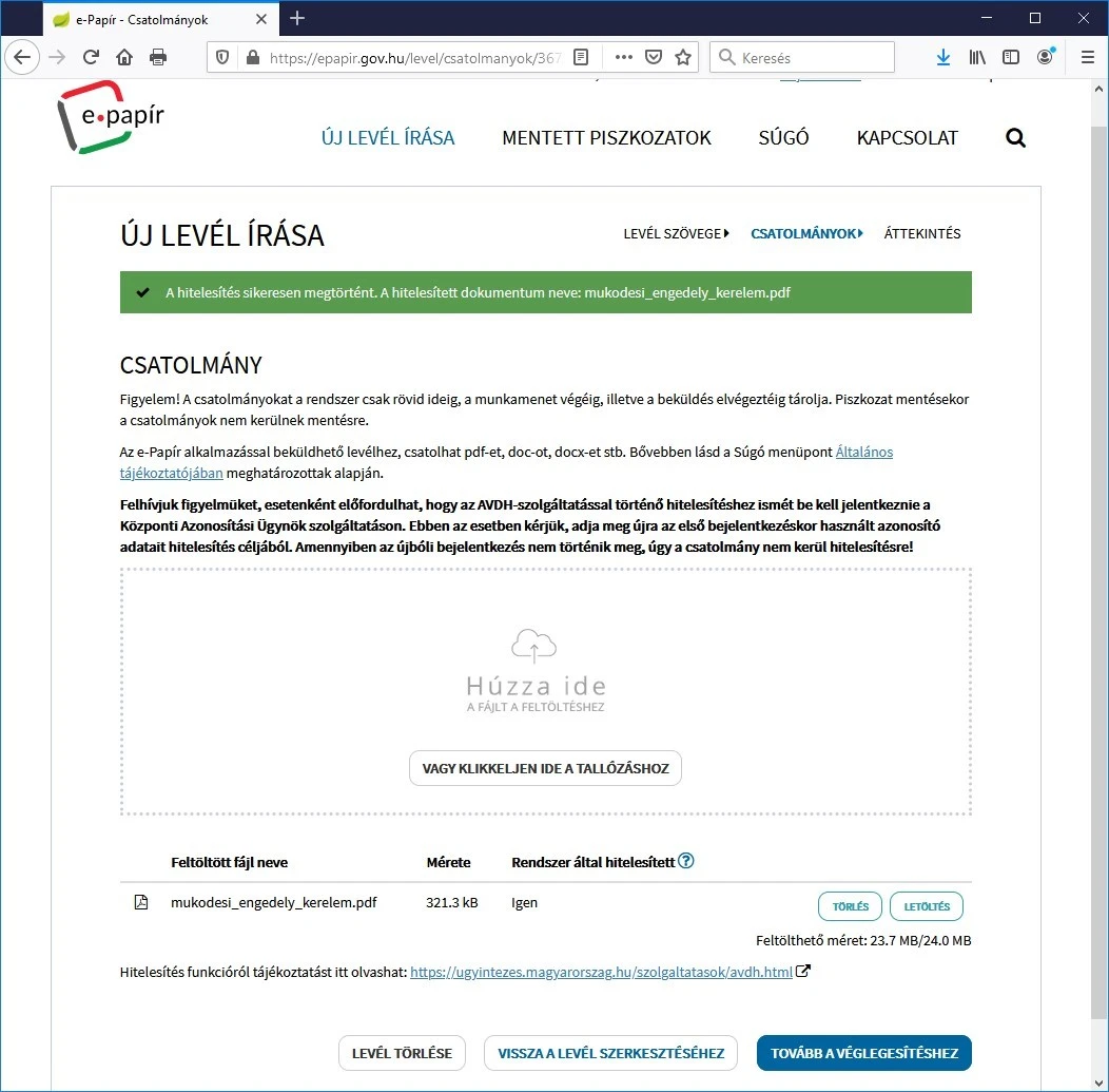 - a hitelesített dokumentum-csatolmányokat rögzíteni, majd véglegesíteni szükséges.